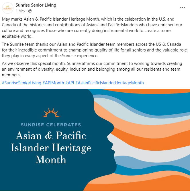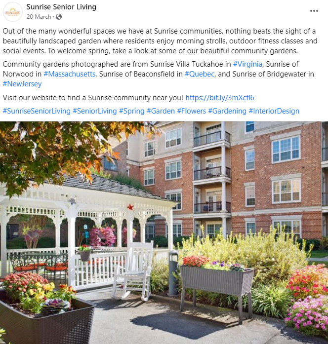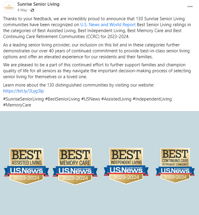 At Sunrise Senior Living, I crafted and published tailored social media captions targeting specific audiences on different platforms.